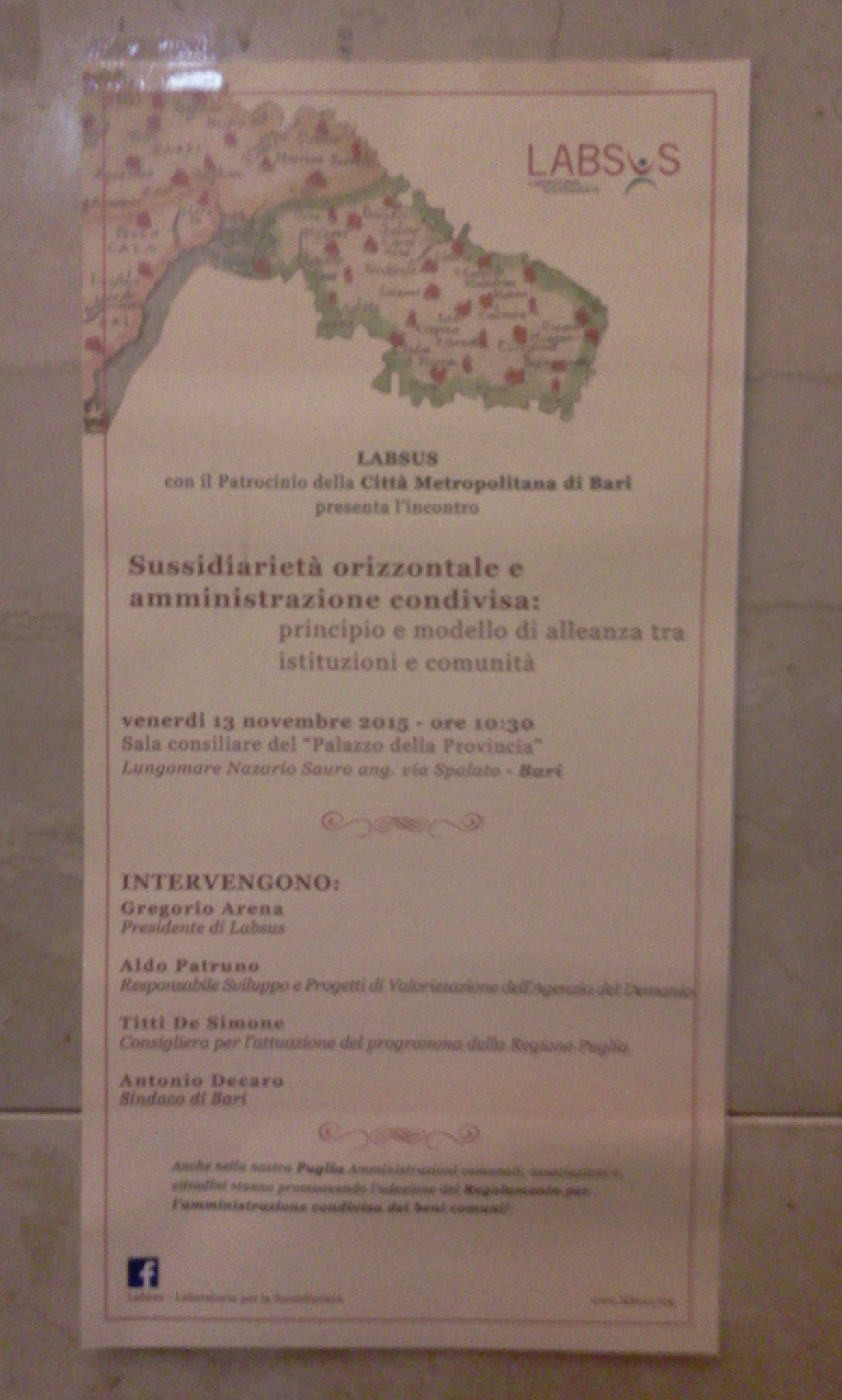 “I beni comuni – ha spiegato Gregorio Arena, presidente nazionale di Labsus, protagonista a Bari del seminario “Sussidiarietà orizzontale e amministrazione condivisa” – non sono neutrali, ma il Regolamento che proponiamo e che può essere modificato sulla base delle esigenze locali è auspicabile che produca la convergenza di maggioranza ed opposizione”. È, questo, uno strumento non solo tecnico-giuridico (il principio relazionale della sussidiarietà è anche un principio costituzionale: art. 118 della Carta), ma anche fortemente sociale perché, se ben utilizzato, potrebbe innescare la scintilla della partecipazione.