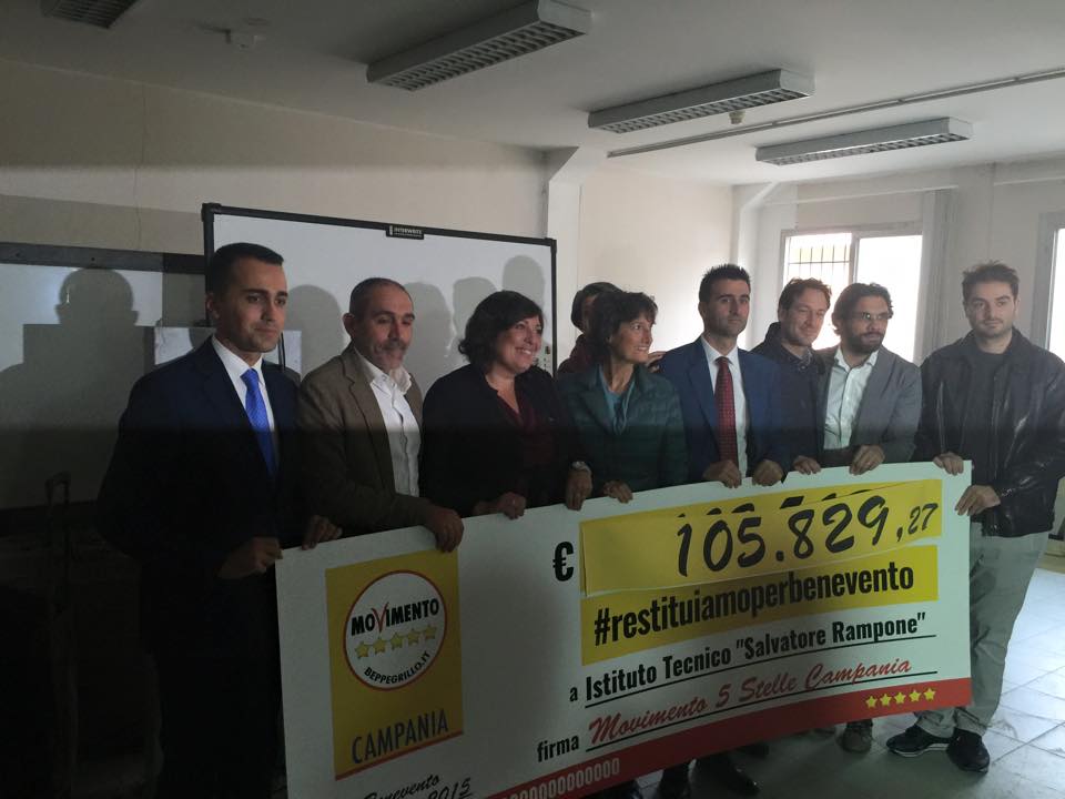 Assieme a 7 consiglieri regionali della Campania del M5S ha consegnato alla preside dell’Istituto tecnico Salvatore Rampone di Benevento un assegno da 105 mila e passa euro.