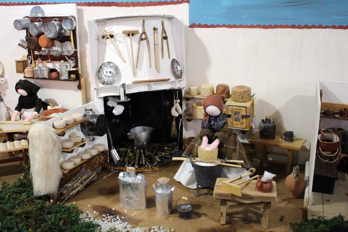 Stanze, oggetti e persone in miniatura, la lavorazione del formaggio, il macellaio, le donne che lavano i panni nel fiume, tessono o preparano pasta, formaggio e dolci.